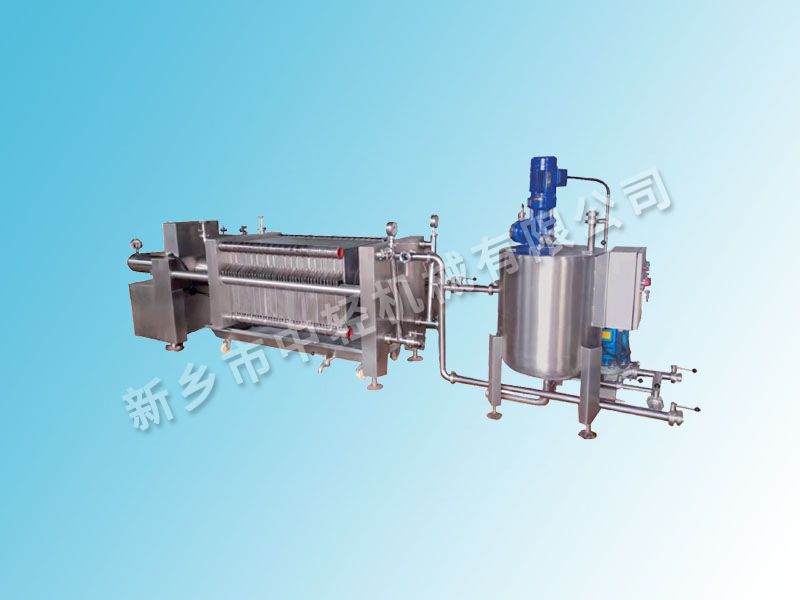 其過濾原理是,待濾液通過泵的作用,輸送到由過濾板、過濾框、密封件及端板連接形成的進(jìn)口通道內(nèi),然后流入端板和過濾框內(nèi);由于過濾前后具有壓力差,待濾液能穿過附著在支撐紙板上硅藻土層流入過濾板內(nèi),在硅藻土的截留、篩分和吸附作用下,將濾液中的菌體或固體顆粒等雜質(zhì)分離出來,澄清后的液體由過濾板另一側(cè)的出口通道流出,實(shí)現(xiàn)液體的澄清過濾。
